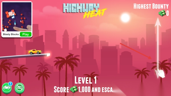 1. 在 LEVEL1 页面,点击“开始”,驾驶黄色汽车顺着公路启程,目标是挣得 1000 赏金并成功逃生。
