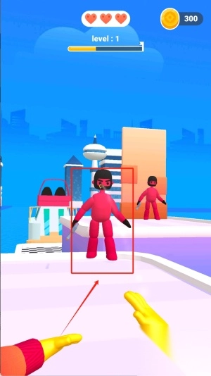 1、进入游戏后观察左上角红框显示的生命值和金币数量,滑动屏幕瞄准身着红衣的目标角色,点击发射按钮投掷长矛进行攻击。