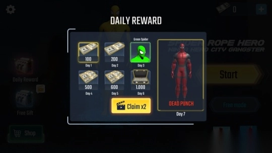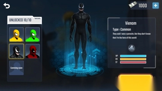 4、选择要出战的蜘蛛侠英雄,现有黄色、绿色、毒液、死侍四种,选好后点击start;
