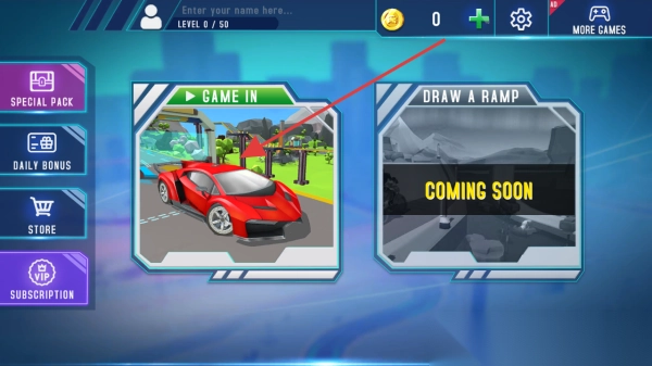 1、在主界面选【GAMEIN】,用红色赛车开启,可领【DAILY】等福利,进入竞速挑战。