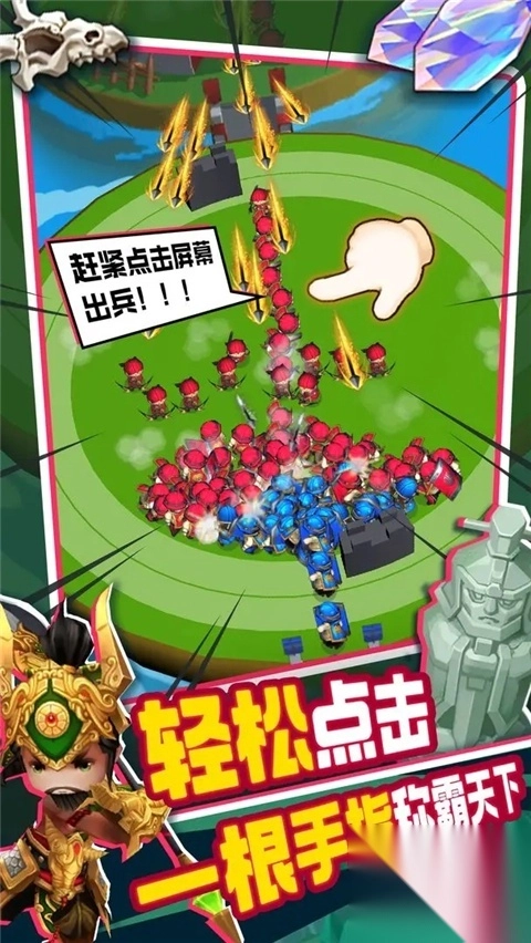 巧妙融合三国题材与休闲弹射等玩法,像开局采用弹射出兵的形式,还有类似物理弹球的限时挑战消灭宝箱玩法,轻松有趣且富有新意。