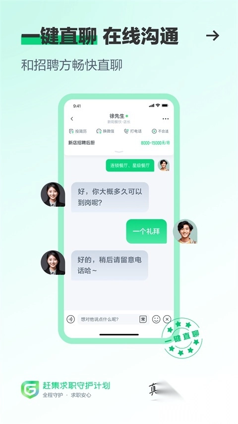 1、聊天找工作:像微信一样,与主管在线聊天,聊爽就上班,一小时就能入职;