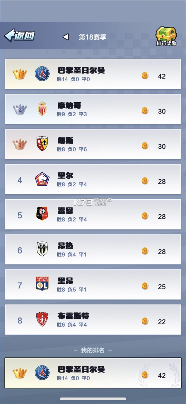 联赛的开始时间是每周日15.00开启,首次分组会按照战力将玩家分配至各个联赛,联赛开始后玩家会与同一联赛内的其他玩家进行随机循环比赛。联赛每天免费进行10轮,然后会进入休赛时间,每轮小组10支球队。一周为一个赛季,赛季结束后根据最后排名进行奖励及升降级的结算。联赛每局胜利后会获取现金,同时也会获取到积分,对应相应的积分榜,积分榜上前三名会有训练手册,其它排名会有不同金额的赛事奖金。