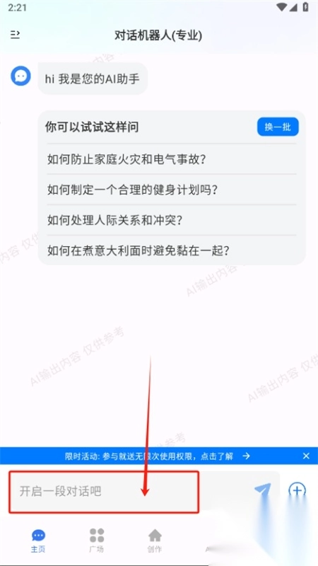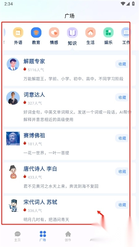3、在广场页面可以选择自己感兴趣的AI机器人进行提问