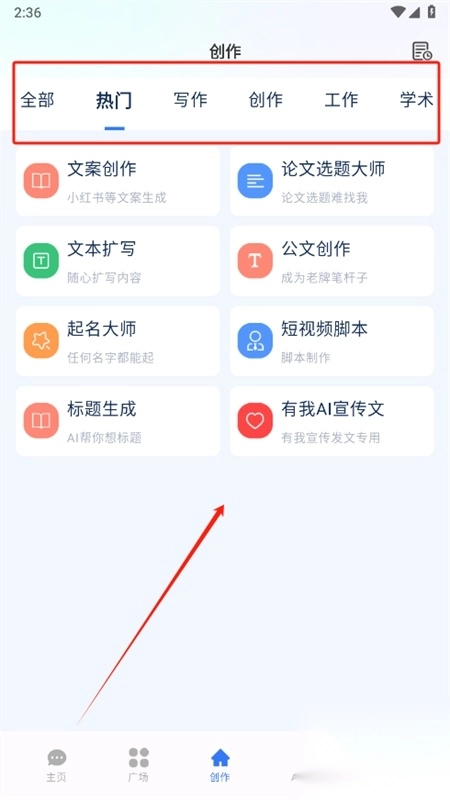 1、一键进行文案创作,各种文案素材让你随意选择;