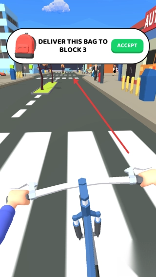 2、遇送货任务(如“DELIVER THIS BAG TO BLOCK 3”),点击【ACCEPT】接取,按箭头指引找目的地,过路口注意交通规则,避行人和车辆。