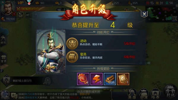 4、游戏的核心资源为银两、粮食、木材、生铁,获取这些资源的主要途径包括:任务、精彩活动、商店以及购买资源(点击游戏界面上方四种资源中任意一种的图标)等。其中,购买资源这一方式最为划算,初始状态下每天可购买10次。玩家能够通过提升VIP等级或者开通尊享特权,来提高每天可购买的次数上限。若开通传奇特权,可实现性价比最大化,即购买资源的价格最高不会超过原价的6折。