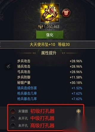每个装备共有3个孔位,分别对应消耗初级、中级、高级打孔器,每次打孔都是必定成功的,需要按顺序进行开孔。