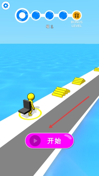 1、点【开始】,控黄人推金币堆,沿水上道路,收集金条,避落水。