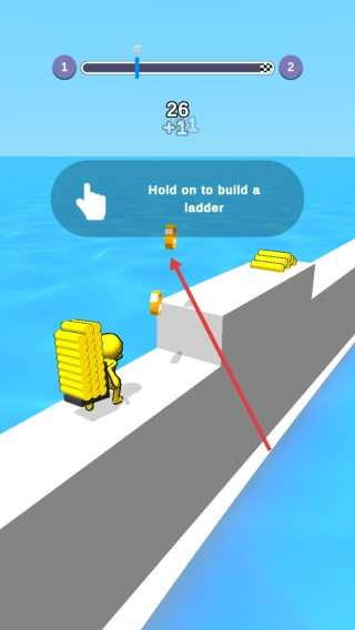 2、碰到高台时,长按“Hold on to build a ladder”,使用金币搭建梯子,翻越障碍,继续奔跑。