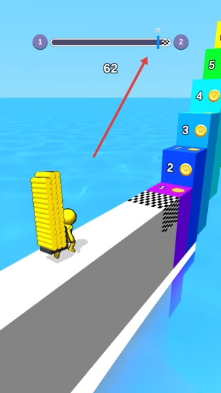 3、冲彩色阶梯(1-5级),吃金币,攒62进度,到终点,赢奖励,解锁新角色。