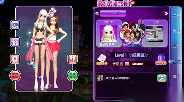 和对方成为好友后,通过提升“友好度”,就能进阶成为“密友”啦!一旦成为“密友”,不但能够为对方设置专属昵称,还可以设定专属动作哟!呀,差点忘了说!还有神秘的“密友奖励”可以领取呢!当“密友等级”提高,还能够解锁专属的合成服装哦!