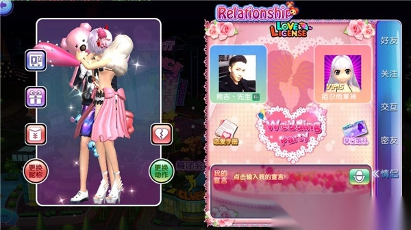 当你们成功成为好友甚至密友,便能通过提升“友好度”或“亲密值”,进而申请成为令人羡慕的“情侣”哟!一旦成为“情侣”,紧接着通过结婚,就能正式开启夫妻系统啦!成为夫妻之后,你们不仅能够为对方设置独一无二的专属昵称,还可以设定只属于彼此的专属动作呢!哎呀,差点忘了说!还有神秘的“情侣奖励”等着你们去领取哦!随着“婚龄等级”逐步提升,更能解锁超特别的专属合成服装呢!是不是已经心动不已啦?心动就赶紧行动起来,快去寻觅那位令你怦然心动的Ta吧!