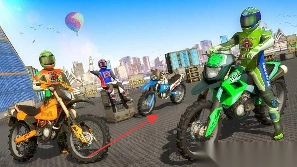 1、物理引擎模拟:精准计算车身重心惯性与落地角度,过度操作会导致车辆失衡翻滚,真实还原摩托运动的物理特性。