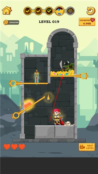 3、想要过关就要让骑士成功获得宝藏,移动横杆,通过宝剑、岩浆等道具击败怪物,解救公主,最后获得宝藏。