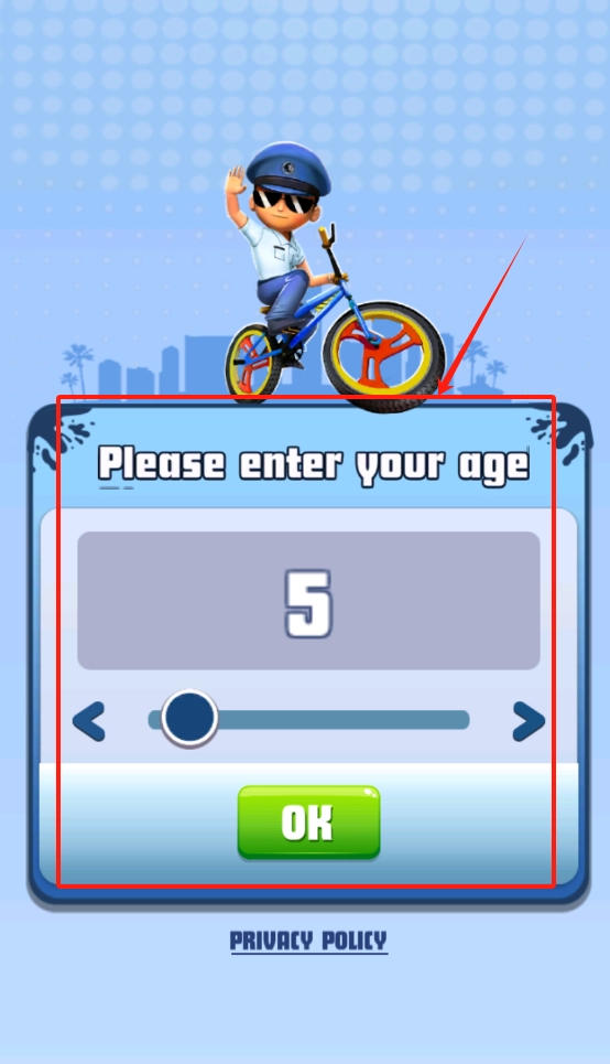 2. 输入年龄后,点击绿色的“OK”按钮。若已有数字5,可使用上下箭头进行调整。同时,请注意隐私政策提示。