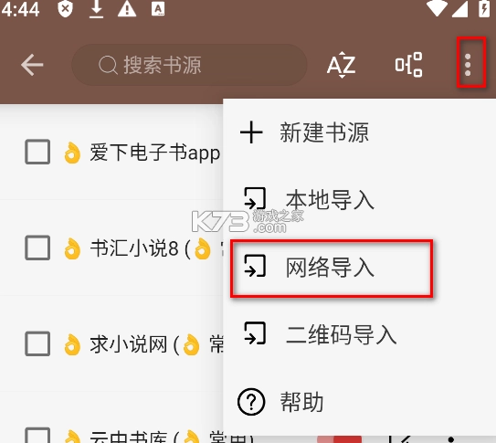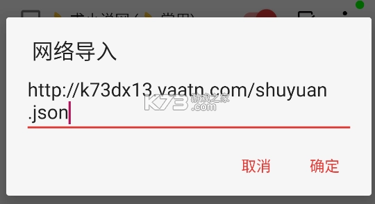 3、点击菜单栏,选网络导入,导入书源链接即可;http://k73dx13.vaatn.com/shuyuan.json,需要一点时间加载,耐心等待