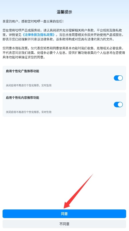 1、首次使用需仔细阅读用户协议及隐私政策,确认无误后点击同意选项进入操作界面。