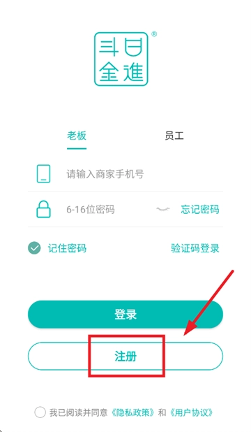 先下载日进斗金服装软件,完成安装后打开该软件。当进入登录界面时,点击“注册”按钮。