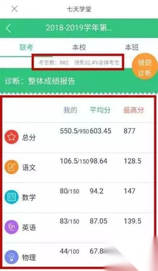 5、若选择“答题情况”与“诊断报告”,就能查看各科目满分、平均分、年级最高分等相关数据,还有个人历次考试的分析报告。