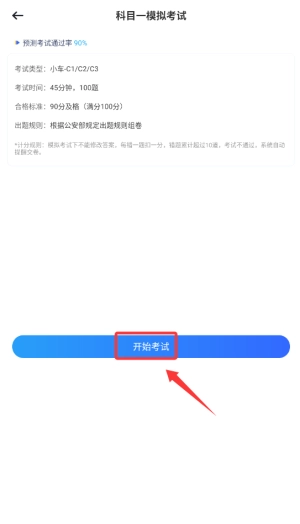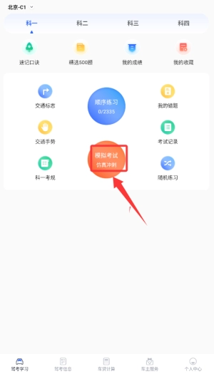 1. 打开驾考模拟科目一APP,在首页的功能栏里挑选“模拟考试”这一选项,随即进入测试准备界面。