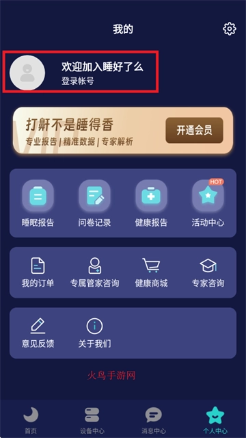 首先打开睡好了么app,点击右下角“个人中心”选项;