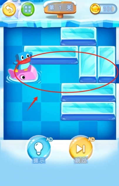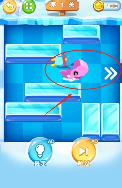 2. 按照图中给出的提示进行操作,每一关的冰层布局各有差异,需巧妙运用炸弹与加速道具,否则小家伙会被困住。