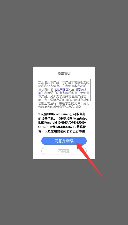 1. 初次使用AI数数APP时,务必认真阅读用户协议及隐私条款,确认同意后,点击“同意并继续”,方可进入主界面。