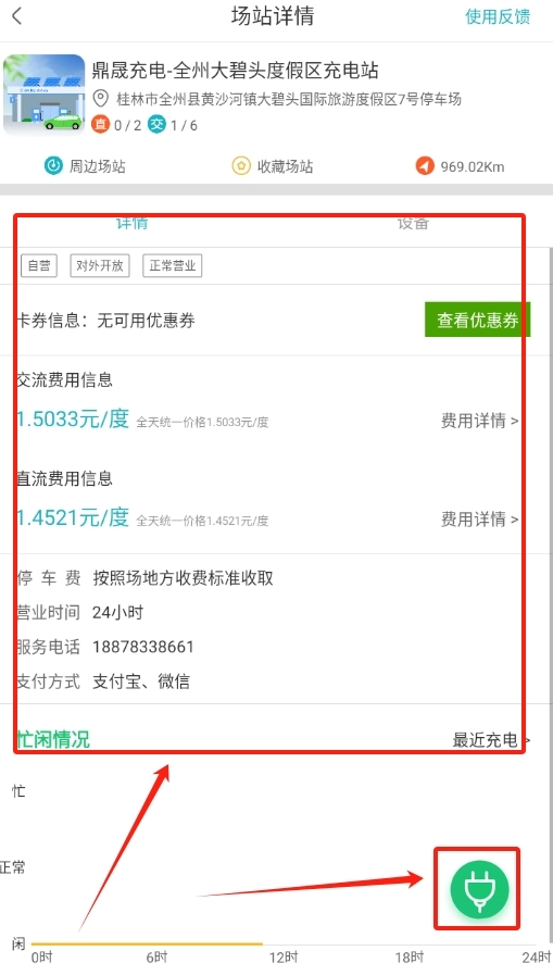 3、点击进入充电站页面,仔细查看费用详情,若决定在此充电,直接点击页面右下方的插头按键即可。