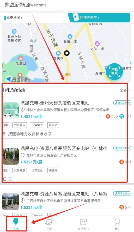 2、成功登录后进入软件首页,在众多展示的充电站中,随意点击一个你打算前往的充电站。