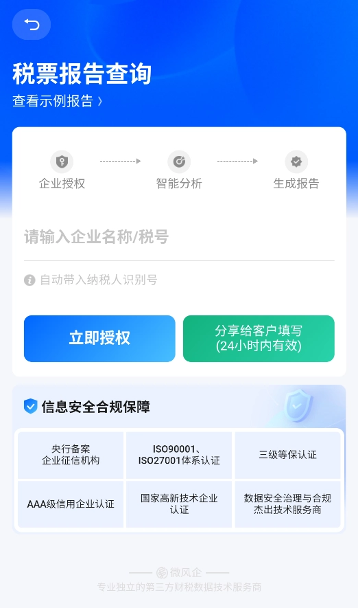 2、通过“税票核验”功能,授权查询企业开票数据,验证真伪并分析业务关联性。