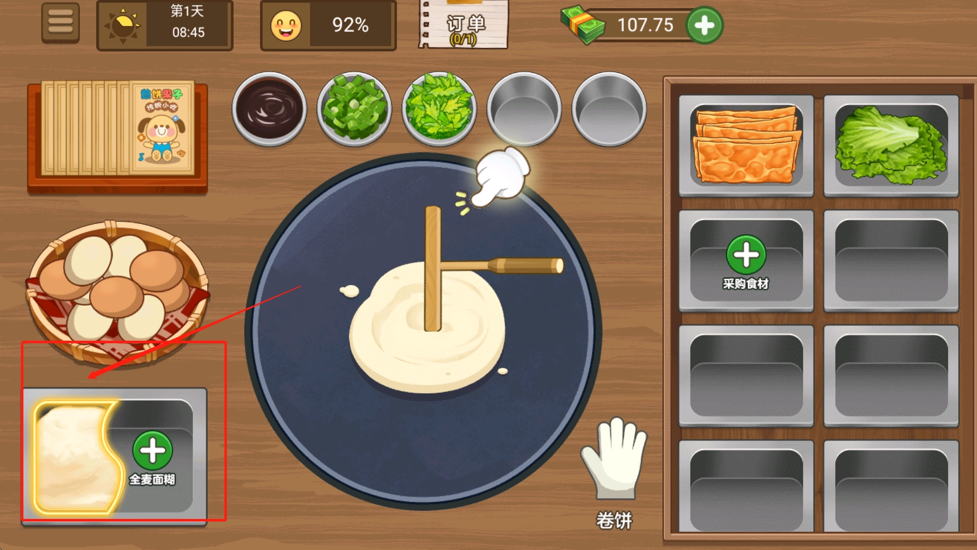 1、第一步,点击面糊,放置到锅上,接着使用手柄把面糊涂抹均匀。