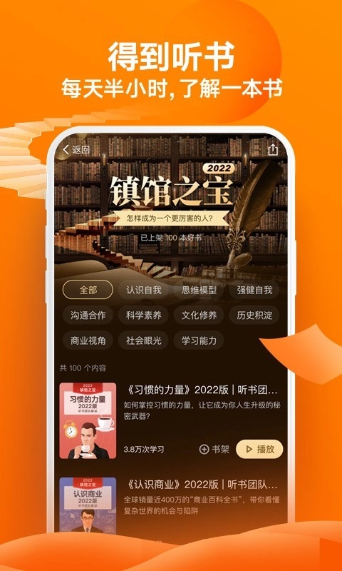 2、下载安装得到阅读app免费版,无论是跑步、晨起还是睡前,都能解放双手和眼睛,听说书人为你讲述好书,一年轻松收获365本好书的干货。