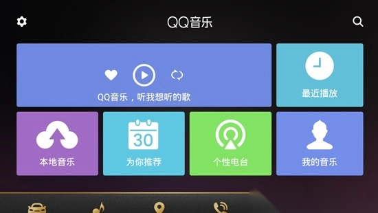 1、在本站下载安装QQ音乐车机版,可以看到当前播放音乐、最近播放、本地音乐、为你推荐、个性电台和我的音乐六大版块。再加上左上方的设置,和右上方的搜索,这样,所有的功能在首页清晰呈现;