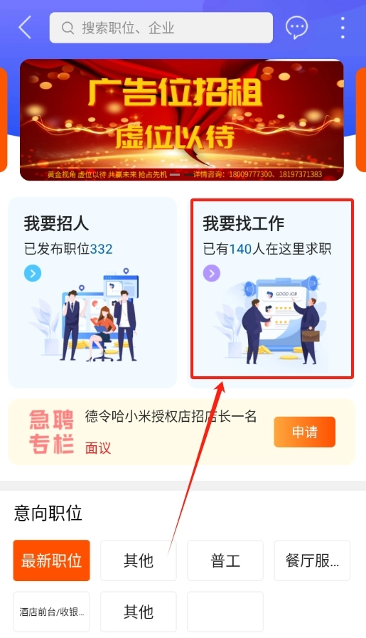 2、登录成功回到首页,找到 “招聘求职” 板块,点击进入招聘页面。