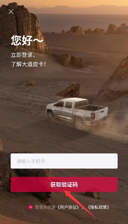 2、在登录页面填写手机号码并获取验证码,勾选用户协议后完成账号登录操作。
