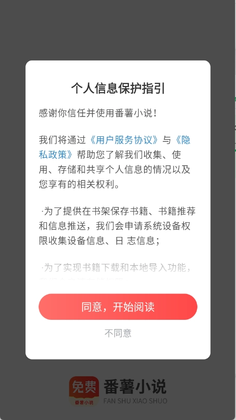 1. 点开番薯小说App,浏览并认可隐私政策及用户协议。