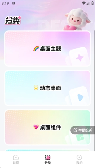 3、分类页面主要按照桌面主题、动态桌面以及桌面组件这几类进行划分,用户可依据自身需求做出选择。