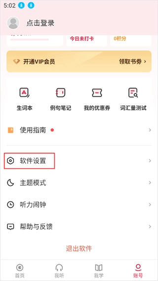 1. 在本站下载并安装每日西语听力app,打开该应用,进入个人账号页面,点击页面上方的“软件设置”选项。