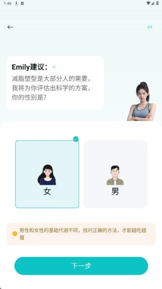 2、输入你的性别、体重、身高、年龄等信息,生成个人档案。