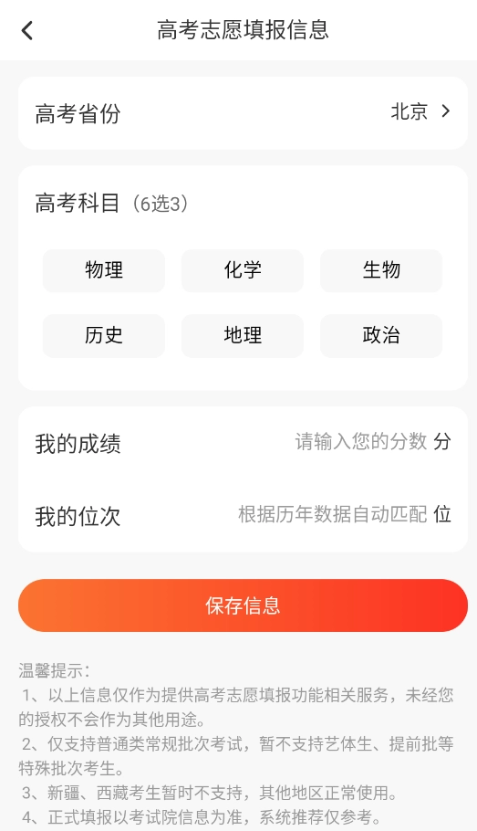 1. 初次使用时,需输入高考分数以及选考科目,届时系统将自动推荐与之匹配的院校专业范围,以供参考并进行选择。