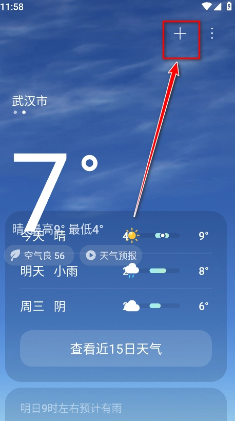 1. 于本站下载并安装小米天气app,进入小米天气首页,点击右上角的“+”号以添加城市。
