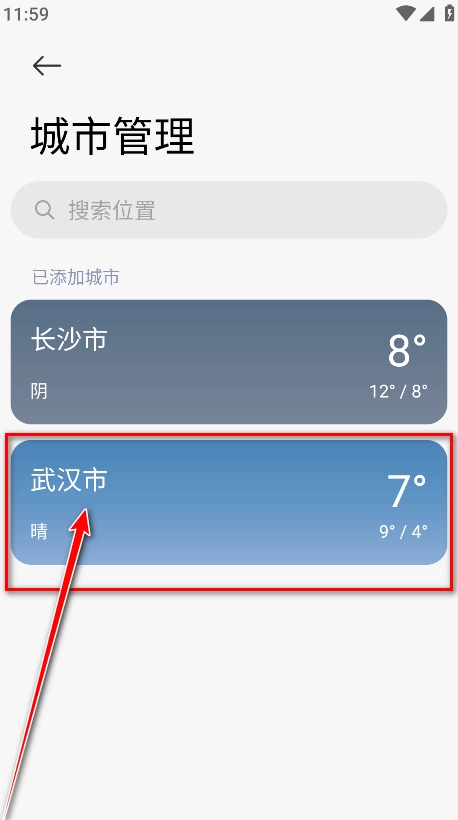 2. 当进入添加城市管理界面后,点击位于上方的搜索框,接着输入我们想要添加的常驻城市名称。