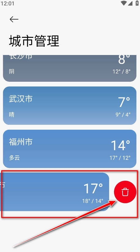 2. 找到想要删除的城市,在其位置上向左滑动,接着点击红色的删除按钮,就能完成删除操作。