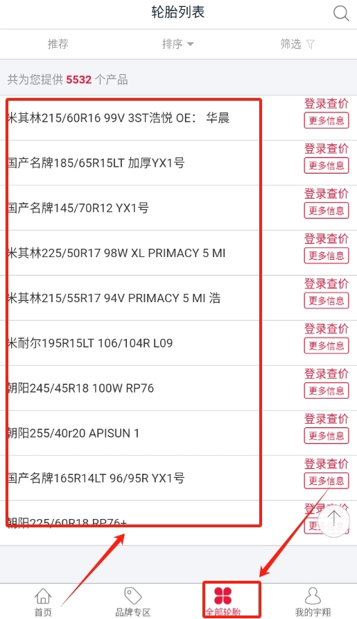 3、进入“全部轮胎”页面,各类轮胎一目了然,在此可便捷查询不同轮胎价格,便于对比挑选。