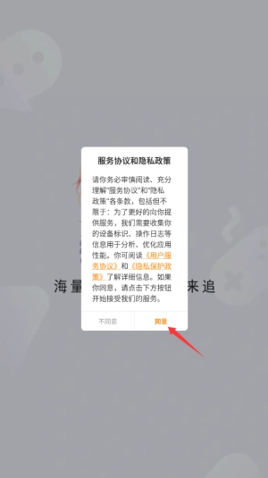 1、启动漫画园APP后,系统会显示用户协议和隐私条款,阅读后点击"同意并继续"进入主界面。