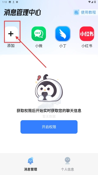 1. 开启消息管理中心应用程序,轻点添加选项,进而进入添加软件的页面。