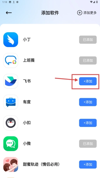 2. 在软件添加页面,能够点击飞书等软件对应的“+添加”按钮,从而添加该软件以进行消息管理。