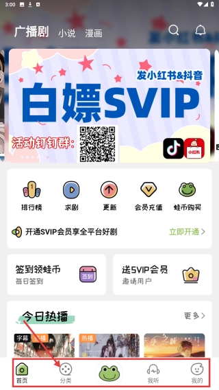 1. 开启涵盖广播剧、小说、漫画等内容的应用,点击底部的分类选项,进入分类页面。