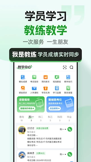 1、学员管理方便快捷:教练能够迅速录入学员资料,创建档案与通讯录,随时查看学习进度及考试状况,实现对学员的高效管理。